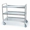 Epoxy powder coated tubular frame and grade 18/12 stainless steel shelves 0,9mm thick. 4 x 100mm swivel castors