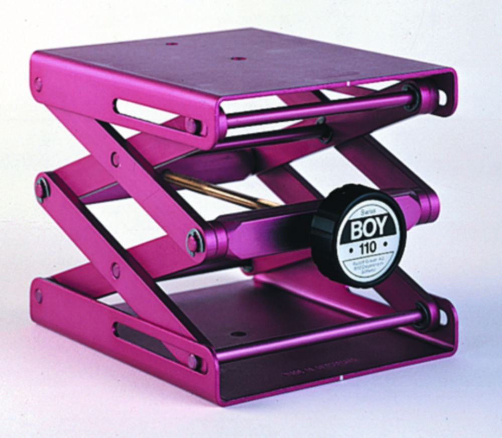 The Rudolf Grauer Lab Jack Swiss Boy 110 is a premium anodized aluminium laboratory jack designed for precise height adjustments. Featuring a red 120×140 mm plate, it provides excellent stability, corrosion resistance, and durability. With a maximum load capacity of 50 kg, this lab jack is ideal for supporting laboratory equipment and ensuring a stable working surface.