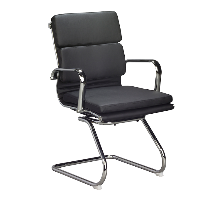 Padded visitor chair made with black bonded leather. Chrome sleighbase, chrome arms with leather cover. Lead time on some products are 14-21 business days.